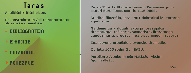 Nazaj Na začetek O Portalu Pošlji E-mail! Na začetek Pošlji E-mail! Na začetek RSD Knjige v elektronski obliki Slovarček kratic Osebna stran Alenke Goljevšček Osebna stran Tarasa Kermaunerja Več o Tarasu Kermaunerju Bibliografija Tarasa Kermaunerja Knjige v elektronski obliki Priznanje Tarasu Kermaunerju Povezave